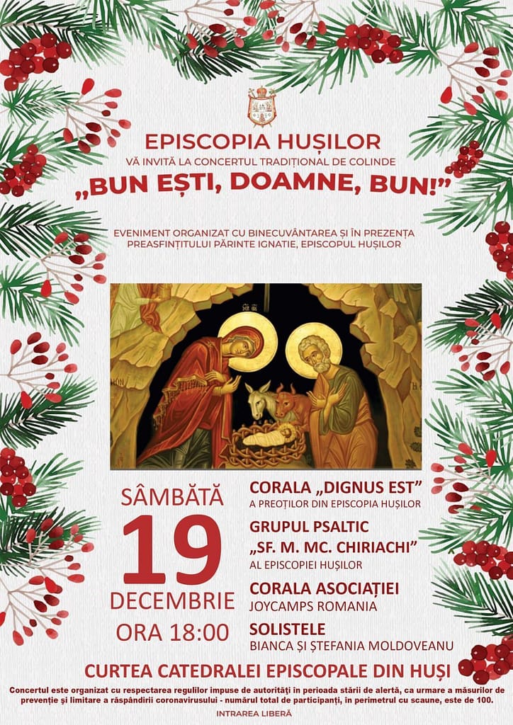 Sâmbătă, 19 decembrie 2020, începând cu ora 18.00, Episcopia Hușilor organizează, cu binecuvântarea şi în prezenţa Preasfințitului Părinte Ignatie, Episcopul Hușilor, concertul tradițional de colinde intitulat „Bun ești, Doamne, bun!” Evenimentul va avea loc în aer liber, în curtea Catedralei Episcopale din Huși. Vor participa Grupul psaltic „Sfânta Mare Muceniță Chiriachi” al Catedralei Episcopale din Huși, Corul „Dignus […]